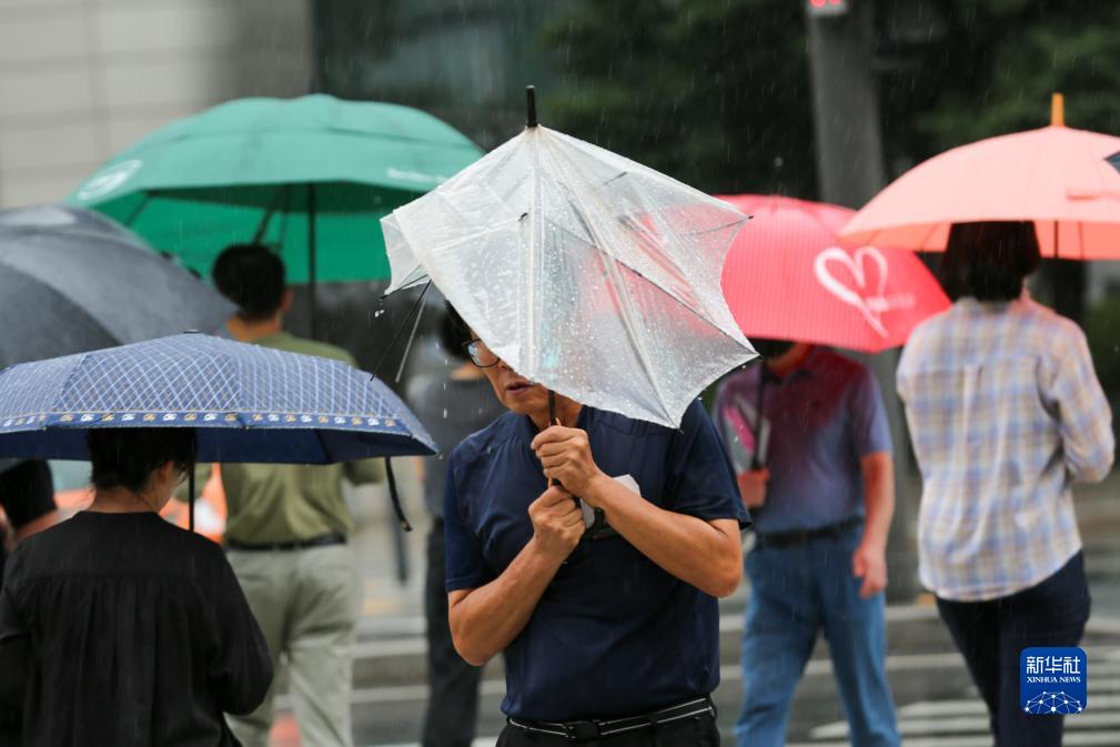 8月10日,在韓國首爾,人們在雨中過(guò)馬路。