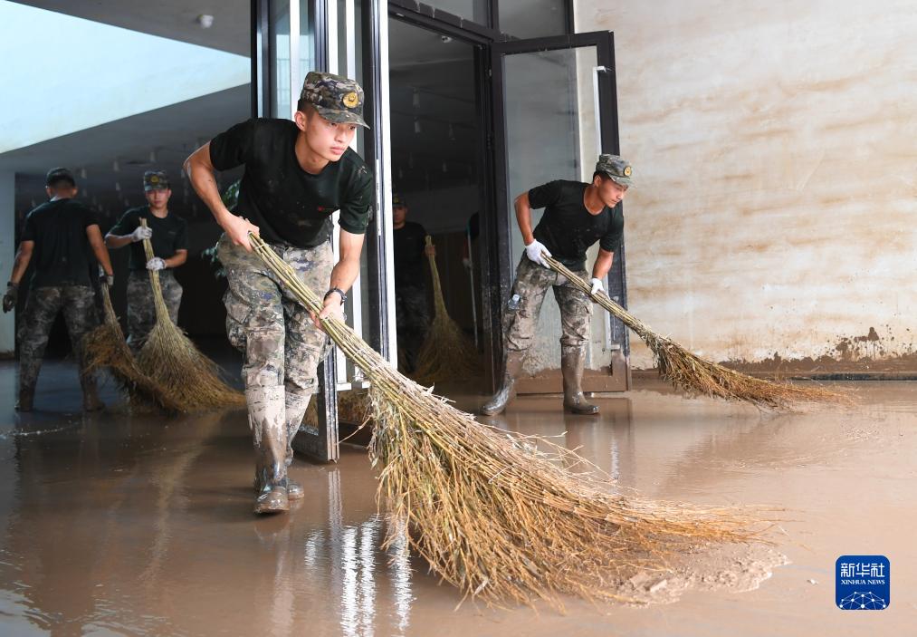 8月10日,武警河北總隊保定支隊戰士在涿州中學(xué)教學(xué)樓清淤。
