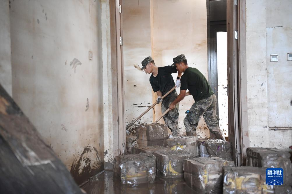 8月10日,武警河北總隊保定支隊戰士在涿州中學(xué)教學(xué)樓清理物品。