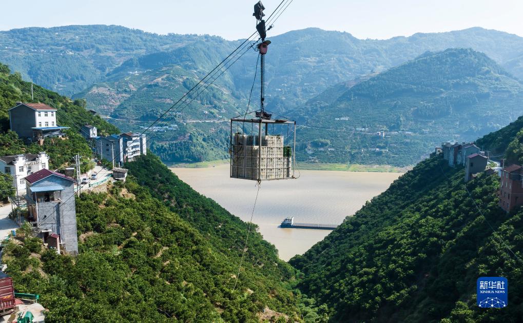 8月10日,秭歸縣泄灘鄉坊家山村村民用空中索道轉運柑橘(無(wú)人機照片)。