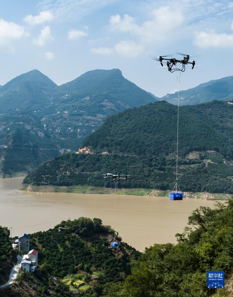 8月10日,技術(shù)人員在秭歸縣泄灘鄉坊家山村幫當地村民轉運柑橘(無(wú)人機照片)。