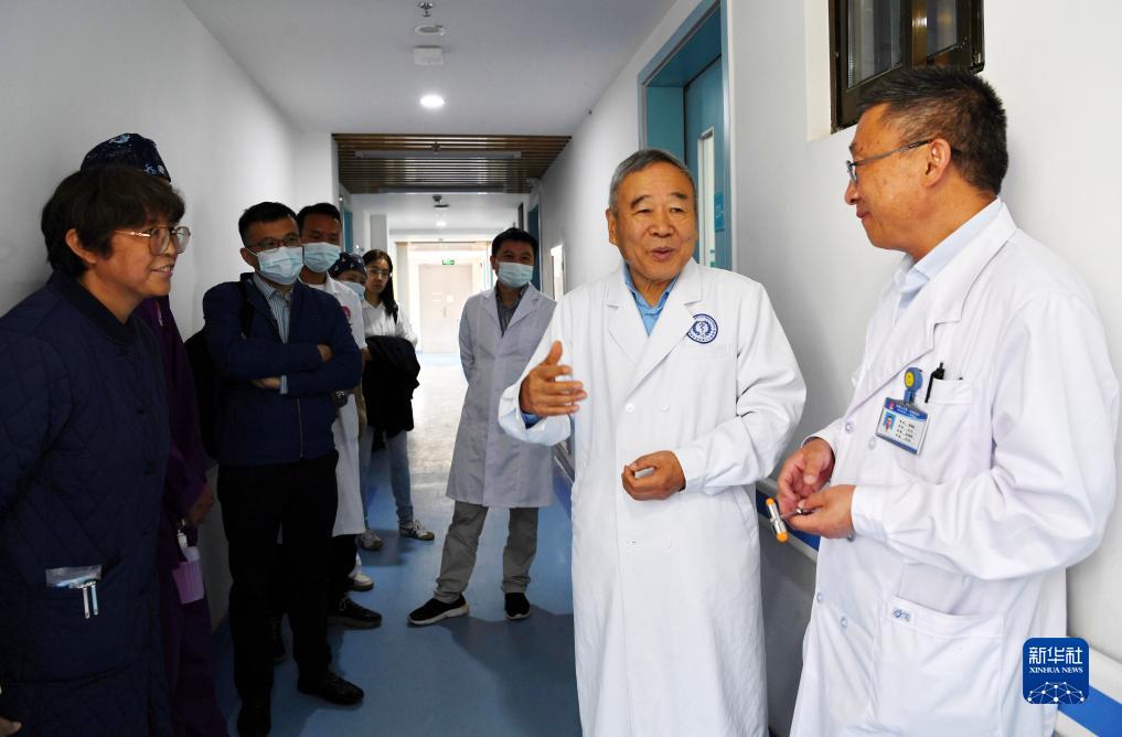 8月10日,中國科學(xué)院院士、首都醫科大學(xué)附屬北京天壇醫院神經(jīng)外科學(xué)中心主任醫師趙繼宗(右二)和西藏第二人民醫院的醫生在醫院病房走廊里交流。