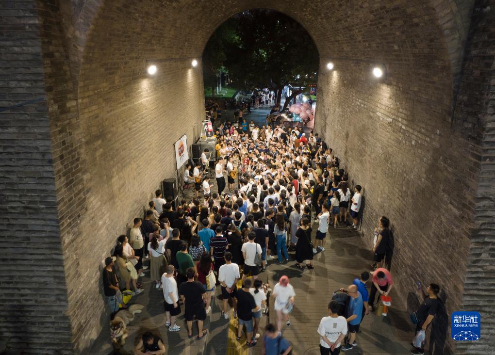 在西安城墻南門(mén)下,市民、游客在觀(guān)賞樂(lè )隊表演(8月10日攝,無(wú)人機照片)。