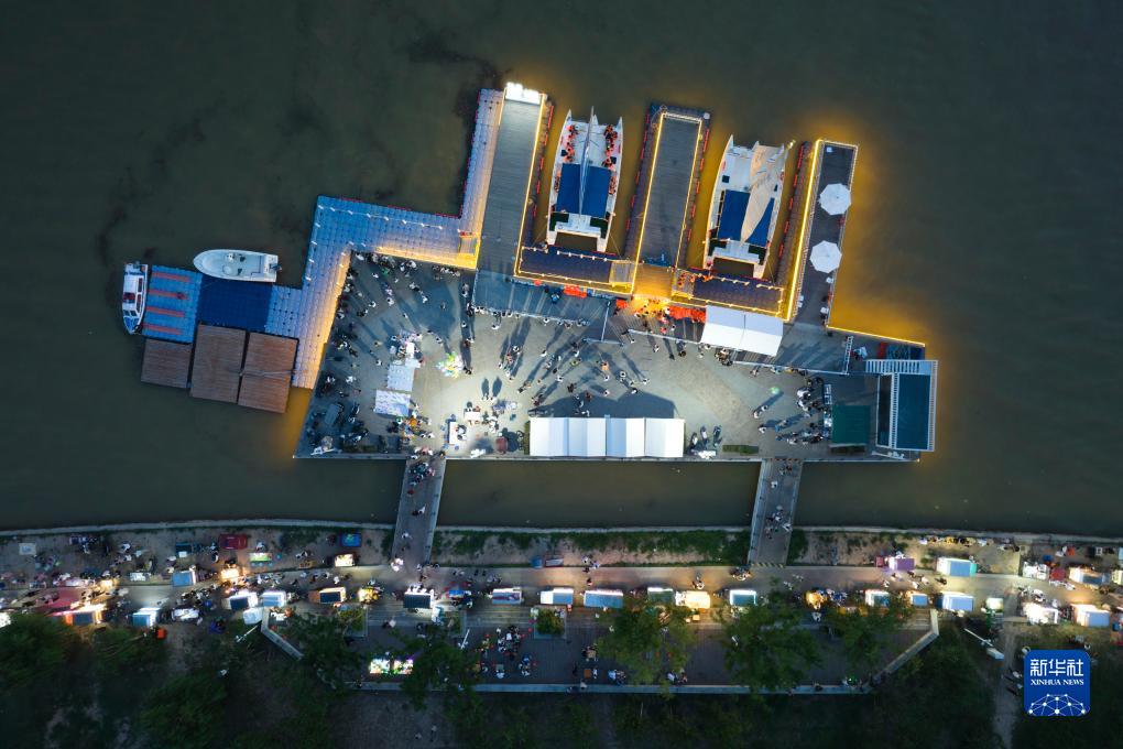 游人在西安市浐灞生態(tài)區一處游船碼頭和后備箱集市上游覽(8月10日攝,無(wú)人機照片)。