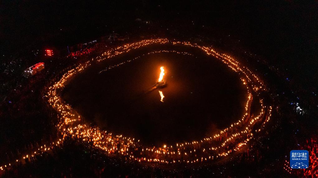這是威寧彝族回族苗族自治縣板底鄉的篝火晚會(huì )現場(chǎng)(8月10日攝,無(wú)人機照片)。