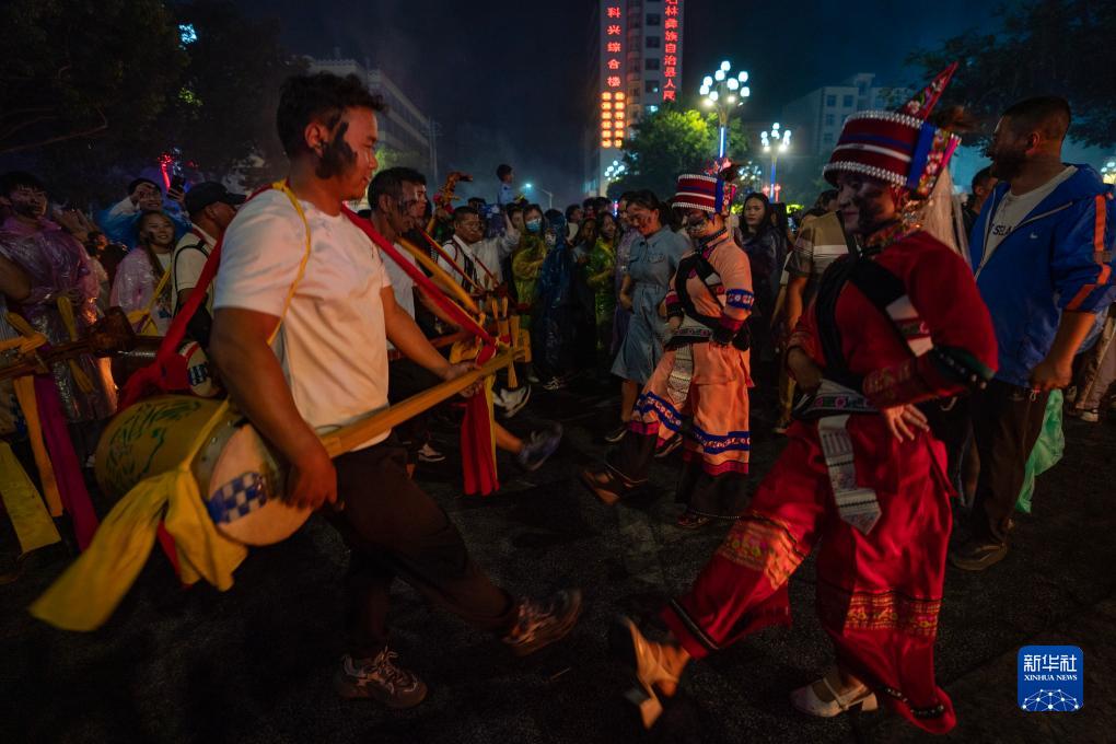8月10日晚,石林當地彝族群眾在火把節上表演彝族大三弦。