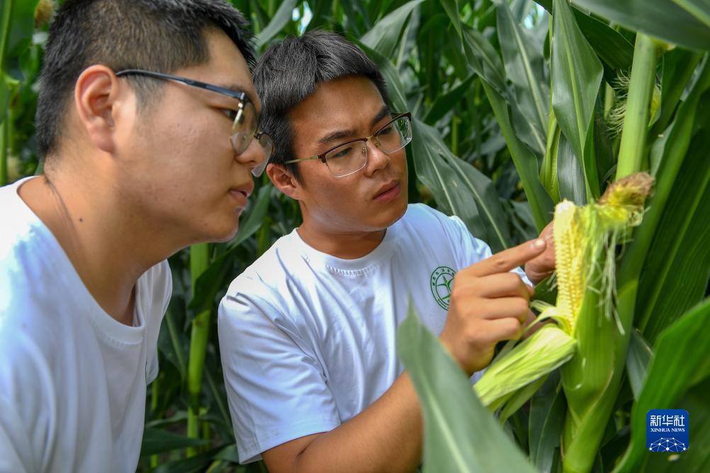 7月31日,在位于吉林省四平市梨樹(shù)縣的中國農業(yè)大學(xué)“科技小院”試驗田,在讀博士生沙野(右)和在讀碩士生蔣家偉查看作物生長(cháng)情況。