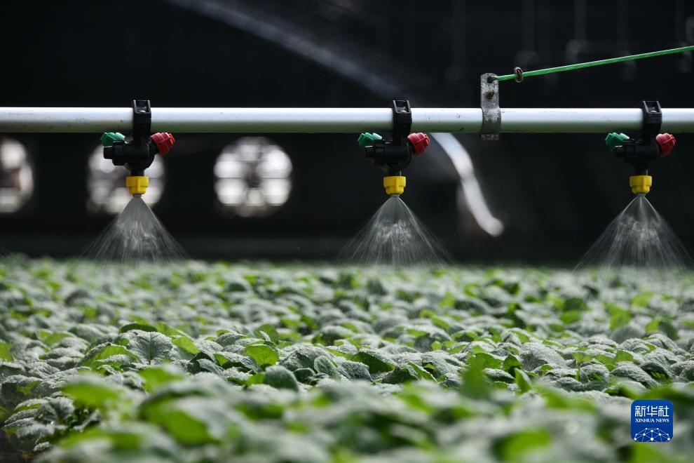 8月11日,在山東省菏澤市定陶區杜堂鎮的一處自動(dòng)控溫大棚內,噴淋系統為蔬菜苗澆水。