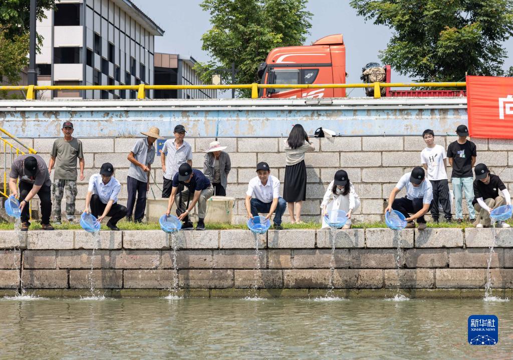 8月11日,在浙江省湖州市吳興高新區幻溇村,志愿者與村民在放流魚(yú)苗。