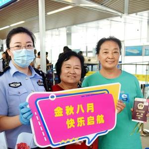 8月11日,旅客在青島郵輪母港復航儀式上合影。