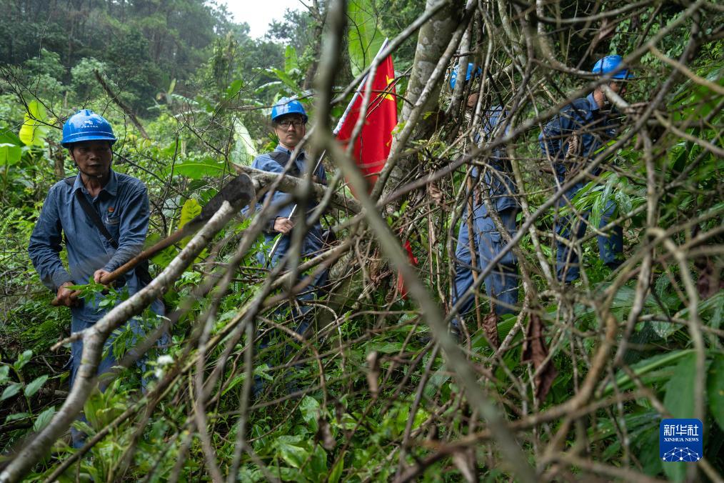 8月10日,溫賢文(左一)用砍刀清理一棵倒伏在山路上的樹(shù)木。新華社記者 費茂華 攝