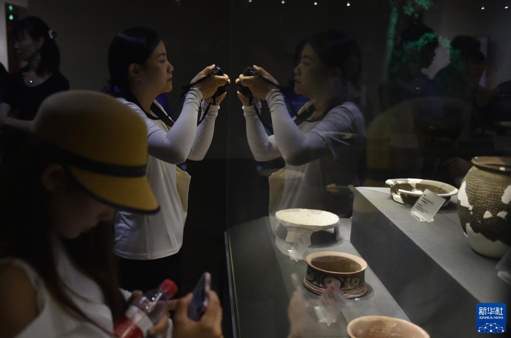 8月8日,參加集中采訪(fǎng)的媒體記者在位于河南省鄭州市的大河村遺址博物館參觀(guān)拍照。