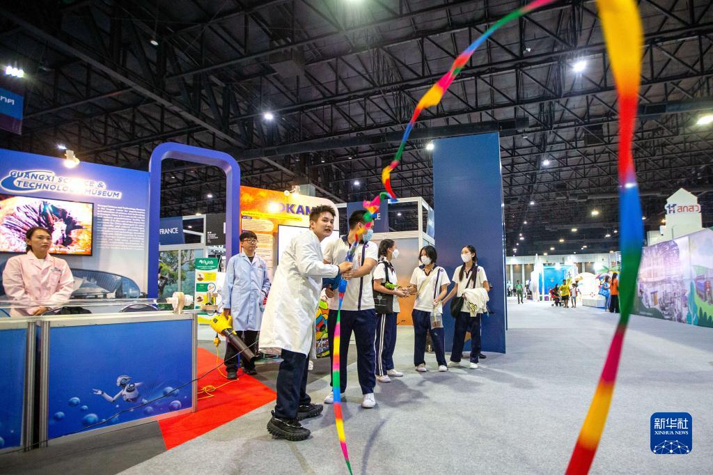 8月11日,在泰國曼谷舉辦的泰國國家科學(xué)技術(shù)展上,參觀(guān)者在中國館觀(guān)看彩帶槍實(shí)驗。