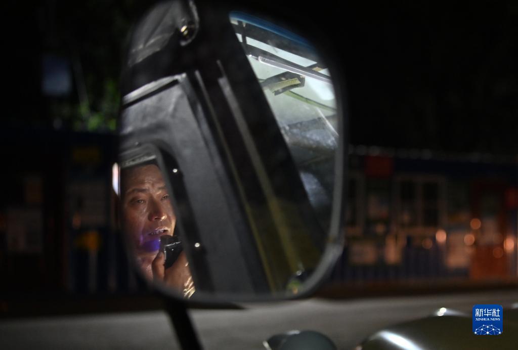 郝慶水在車(chē)內用對講機安排抗洪工作(8月3日攝)。