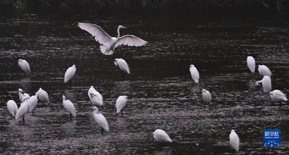 近日,成群的白鷺在山東省滕州市荊河水域覓食、飛舞。