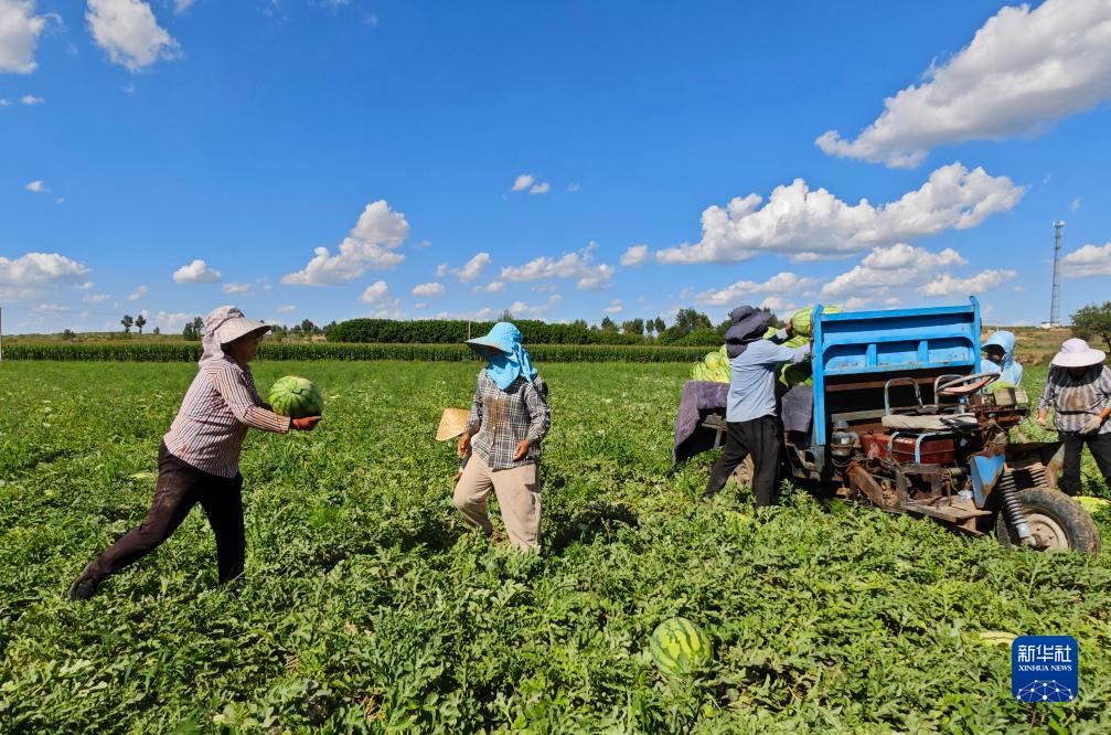 8月12日,內蒙古烏審旗無(wú)定河鎮河南村農民在采摘西瓜。