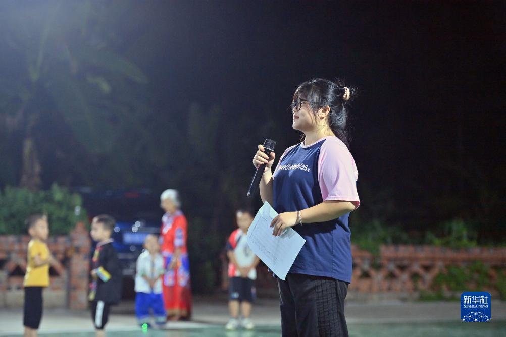 在廣西大化瑤族自治縣大化鎮仁良村,大學(xué)生韋衛江在主持村里的文體活動(dòng)(8月13日攝)。