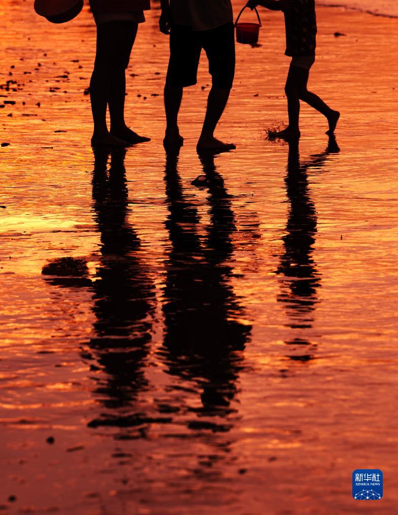 8月14日,游客在金灘上欣賞日出時(shí)的朝霞。