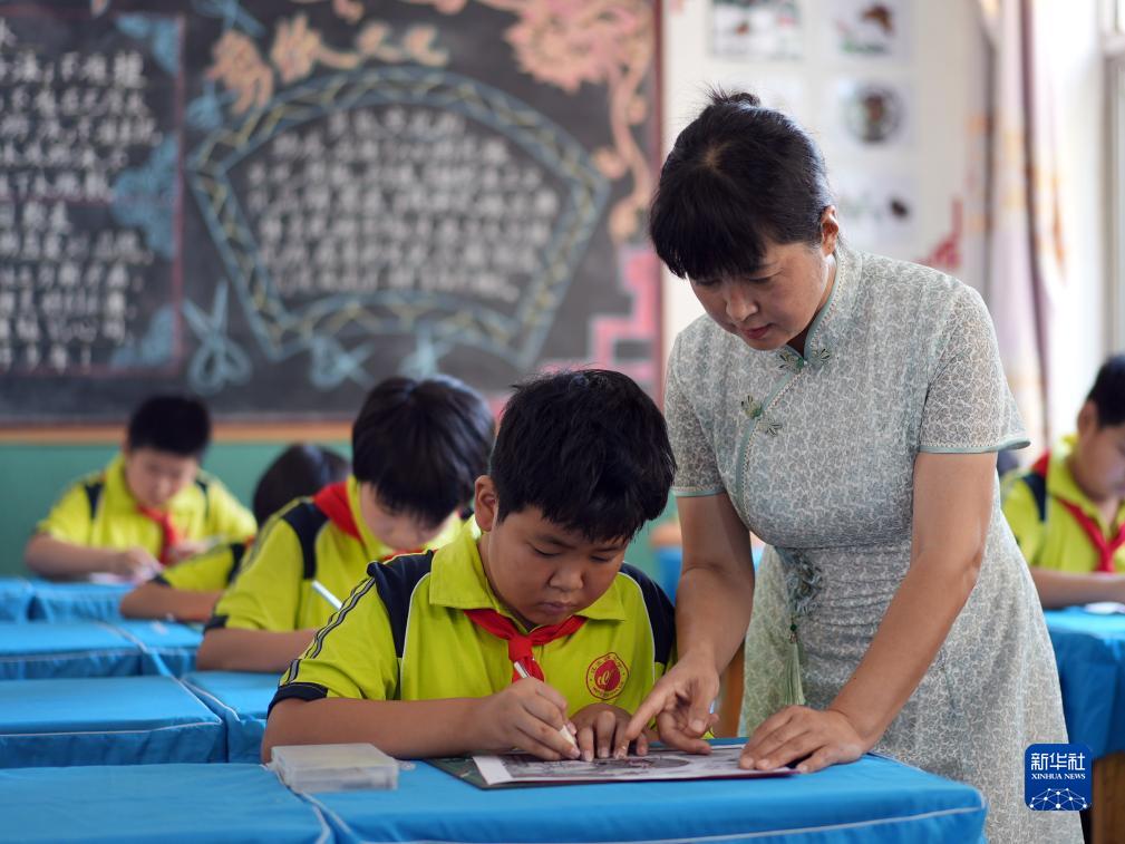 8月14日,在河北省滄州市滄縣汪家鋪鎮汪家鋪小學(xué),老師指導學(xué)生學(xué)習刻紙技藝。