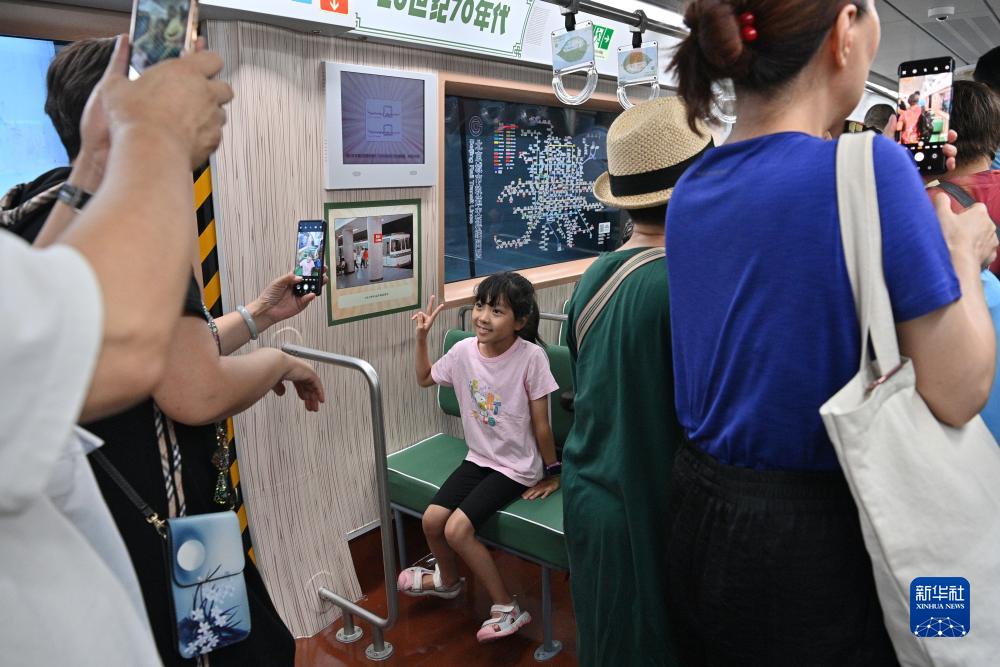 8月14日,乘客在北京地鐵一號線(xiàn)“時(shí)光列車(chē)”上拍照留念。