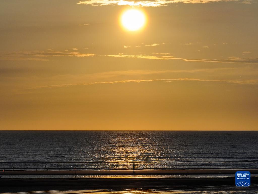 江蘇省啟東市黃金海灘景區日出景色(2023年7月25日攝,無(wú)人機照片)。