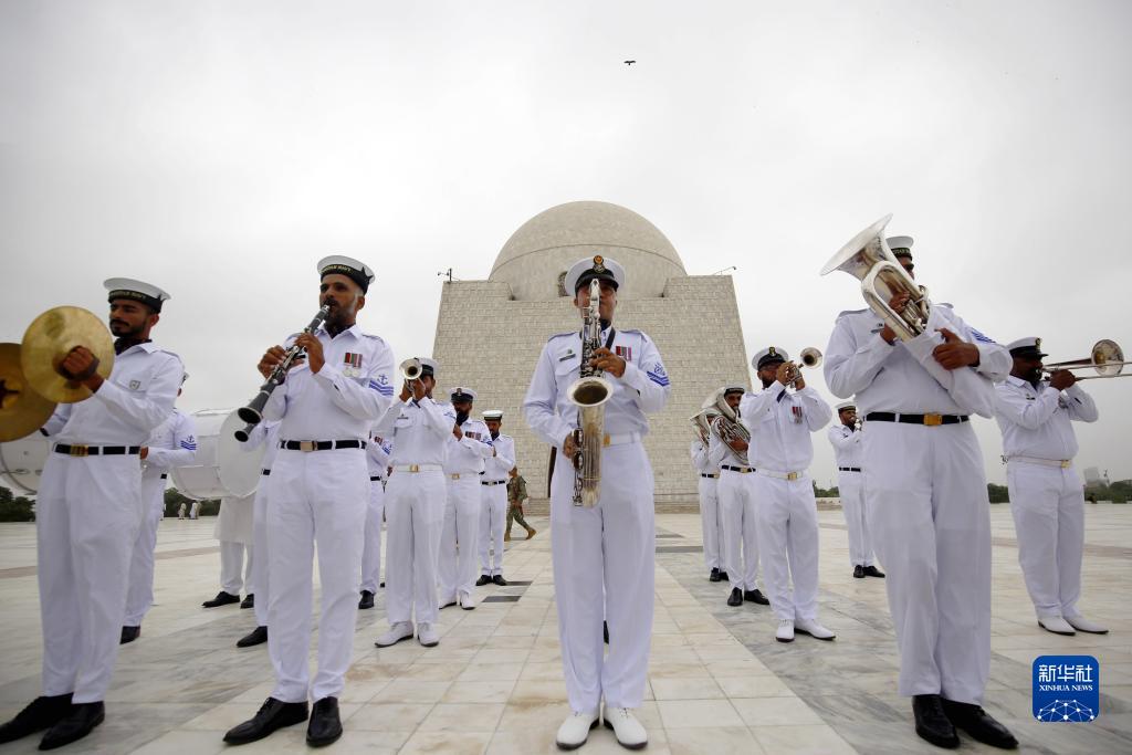 8月14日,在巴基斯坦卡拉奇,軍樂(lè )團在國父穆罕默德·阿里·真納的陵墓前演奏,慶祝獨立76周年。