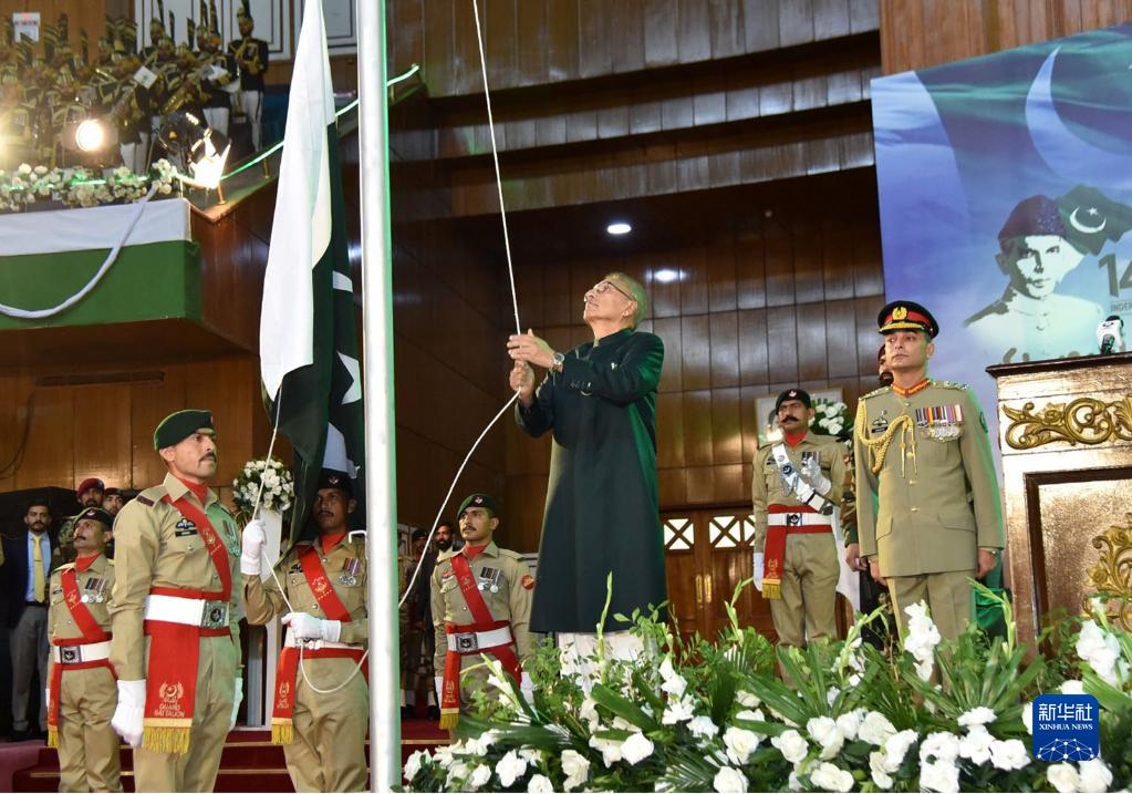 8月14日,在巴基斯坦首都伊斯蘭堡,巴基斯坦總統阿爾維在國家獨立76周年慶?;顒?dòng)上升國旗。
