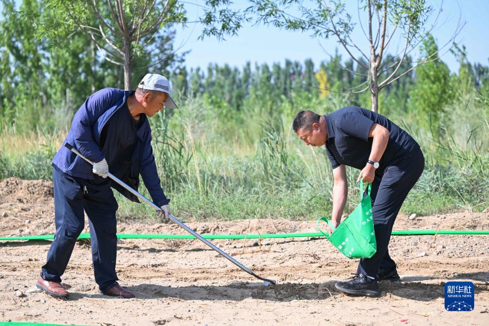 7月22日,內蒙古杭錦旗什拉召治沙站的工作人員在苗圃中播種。