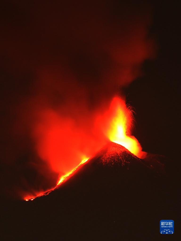 這是8月14日在意大利西西里島卡塔尼亞拍攝的正在噴發(fā)的埃特納火山。