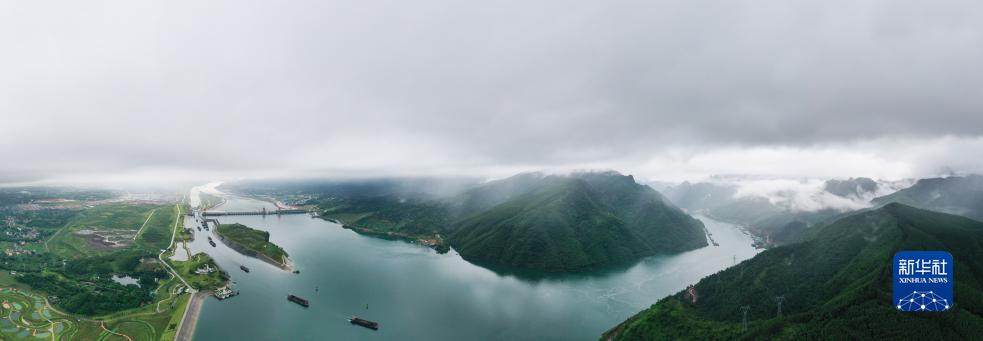 這是8月15日拍攝的廣西大藤峽水利樞紐工程和周邊峽谷(無(wú)人機照片)。