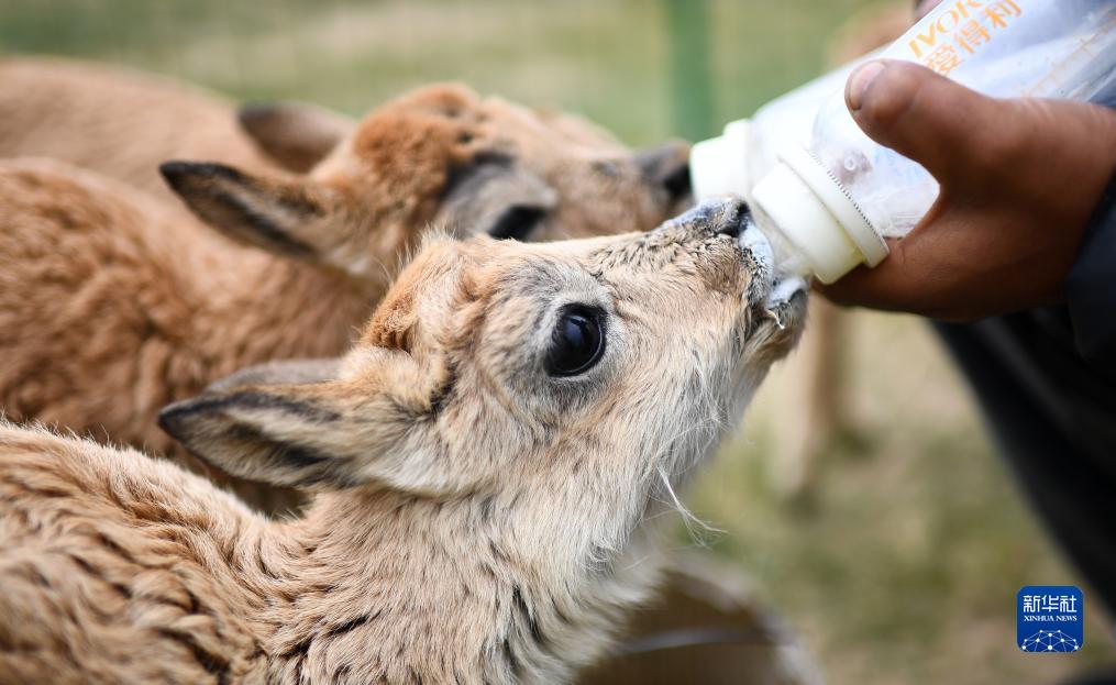 可可西里管理處索南達杰保護站隊員才仁多杰在給被救助的藏羚羊幼仔喂奶(7月28日攝)。