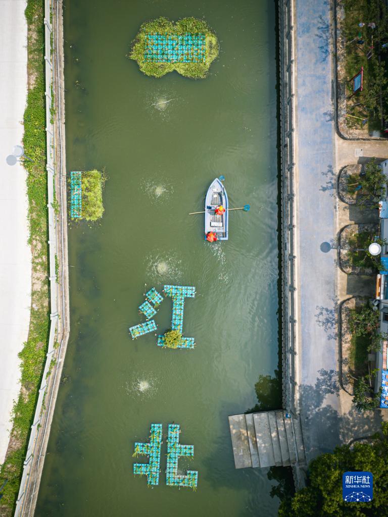 工作人員駕駛小船在寧波市江北區西大河上清理水面(8月11日攝)。近年來(lái),寧波市江北區通過(guò)堤岸整治、河道清淤、建立微循環(huán)系統等方式,提高了西大河的水體自?xún)裟芰退鷳B(tài)環(huán)境。