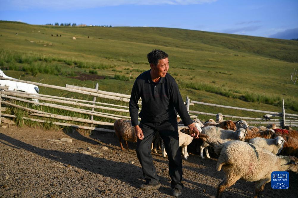 在新疆昌吉市廟爾溝鄉索爾巴斯陶牧場(chǎng)上,一名牧民在羊圈內抓羊,準備出售(8月13日攝)。