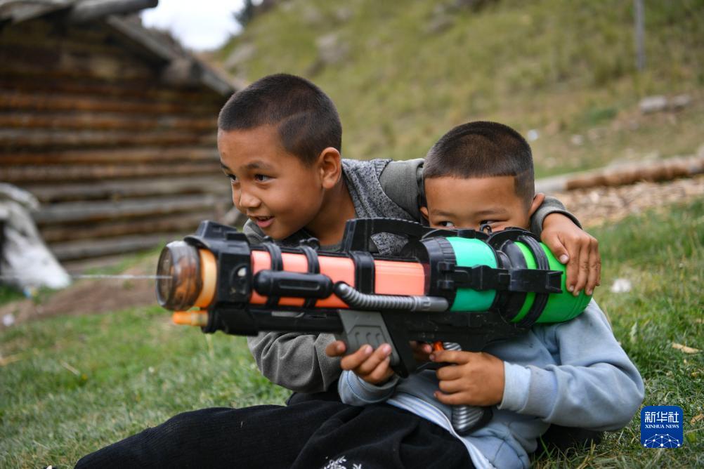 7歲的木巴拉克(左)和表弟一起在索爾巴斯陶牧場(chǎng)上過(guò)暑假(8月12日攝)。