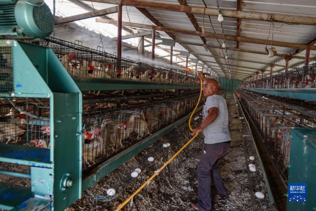 8月14日,在以色列北部馬爾加利奧特村一養雞場(chǎng),一名男子為雞群噴水降溫。