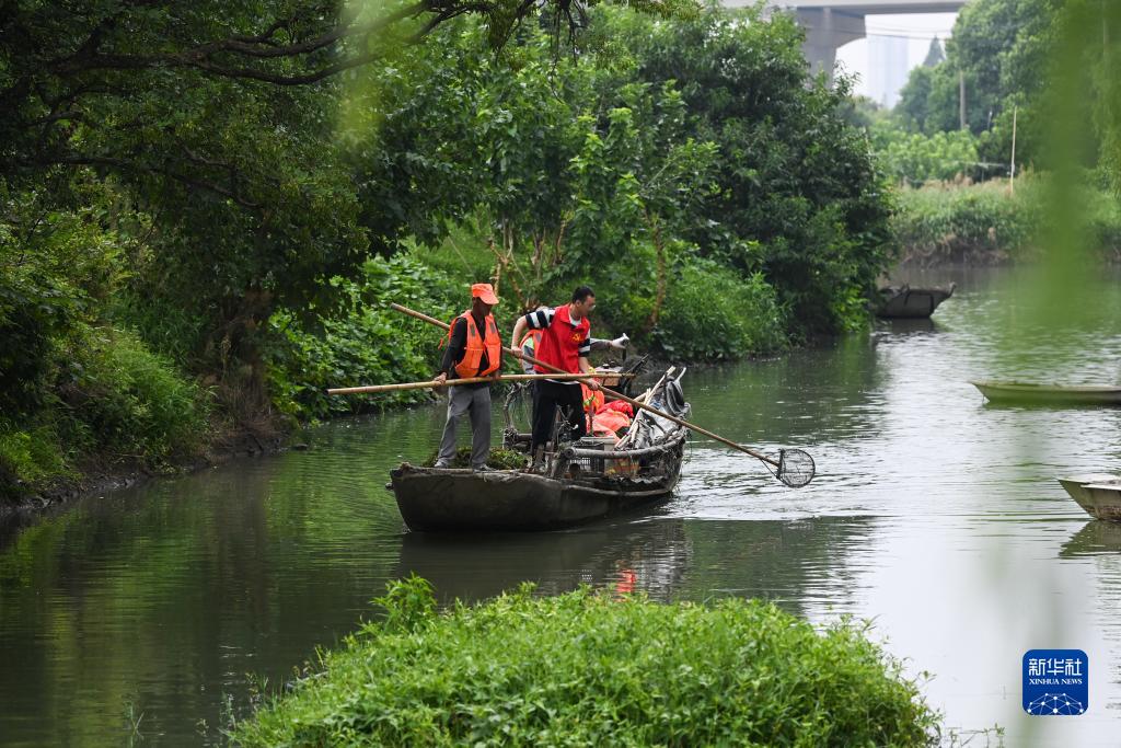 8月15日,在織里鎮港西村楊家埭河段,黨員志愿者和村民在河道做日常水體保潔。
