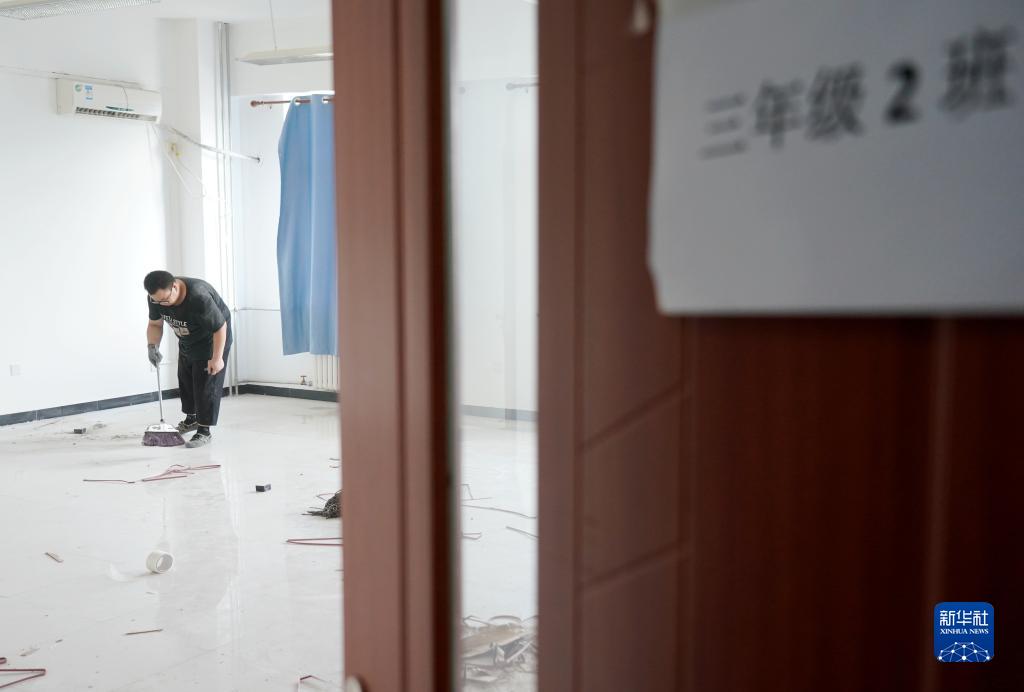 8月14日,北京市門(mén)頭溝區京師實(shí)驗中學(xué)工作人員在打掃新布置的教室,以迎接借址開(kāi)學(xué)的師生。