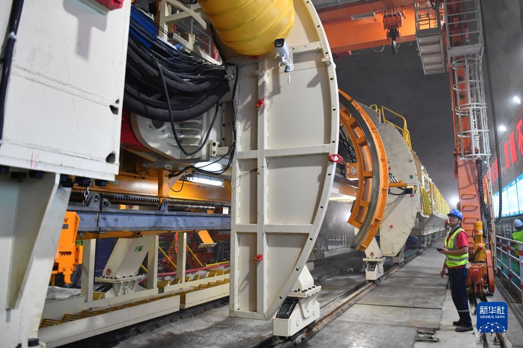 8月15日,在湖南平江抽水蓄能電站引水隧洞建設現場(chǎng),工作人員查看“天岳號”掘進(jìn)機作業(yè)情況。