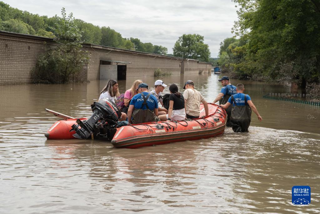 8月15日,在俄羅斯烏蘇里斯克市,救援人員幫助受災居民出行。