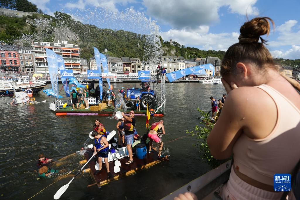 8月15日,在比利時(shí)南部小城迪南的默茲河上,參加者在“浴缸劃船節”上向觀(guān)眾潑水互動(dòng)。