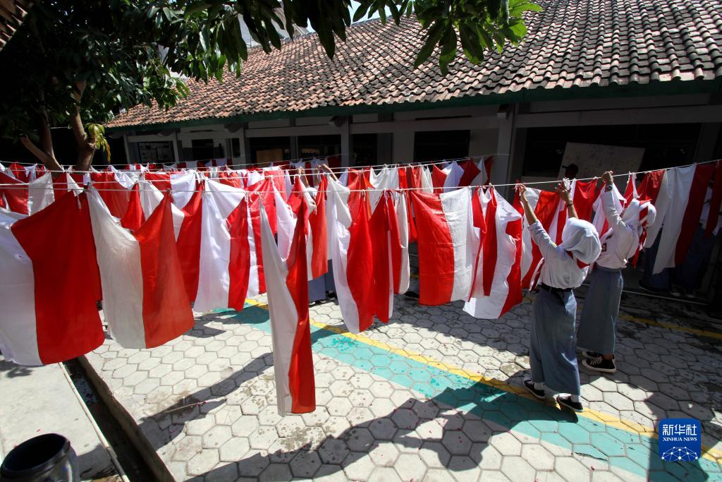 8月15日,在印度尼西亞斯拉根,學(xué)生們晾曬洗滌好的印尼國旗,準備用于布置裝飾,迎接獨立日。