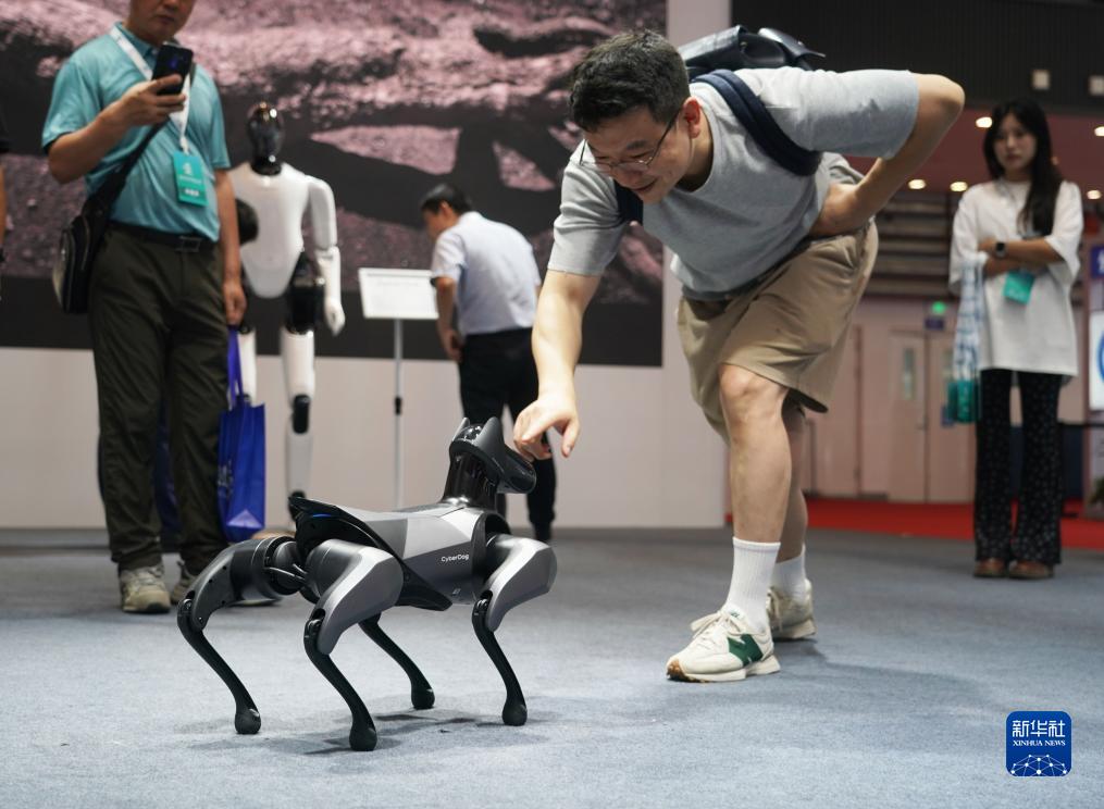8月16日,觀(guān)眾在2023世界機器人大會(huì )現場(chǎng)與一款仿生四足機器人互動(dòng)。