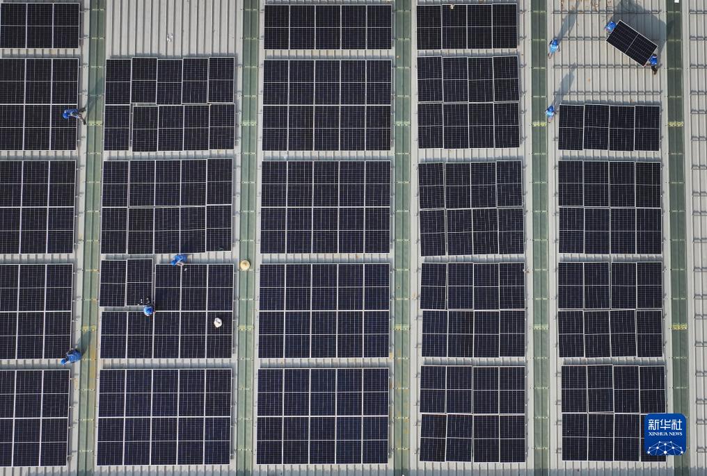 8月16日,工人在唐山市海港經(jīng)濟開(kāi)發(fā)區一企業(yè)的廠(chǎng)房屋頂安裝太陽(yáng)能光伏發(fā)電板(無(wú)人機照片)。