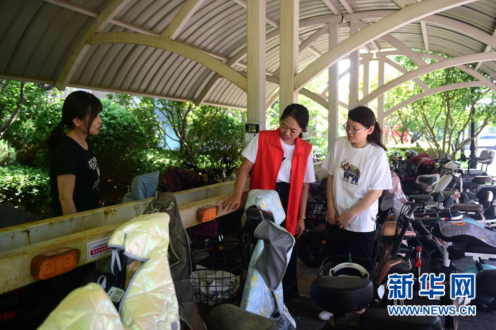 8月15日,滄州市運河區恒大城社區監察聯(lián)絡(luò )員王靜(中),調查電動(dòng)車(chē)存放與充電安全問(wèn)題。新華網(wǎng)發(fā)(謝 辛 攝)