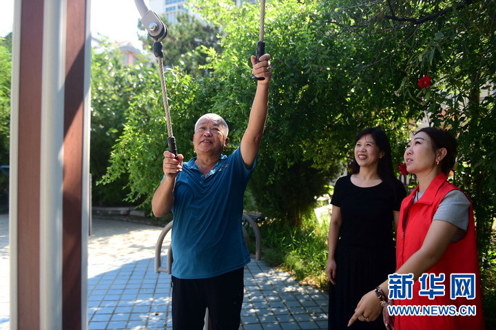 8月15日,滄州市運河區玉蘭灣社區居民向居務(wù)監督員馬藝瑞(右)提出優(yōu)化設置健身器材建議。新華網(wǎng)發(fā)(謝 辛 攝)