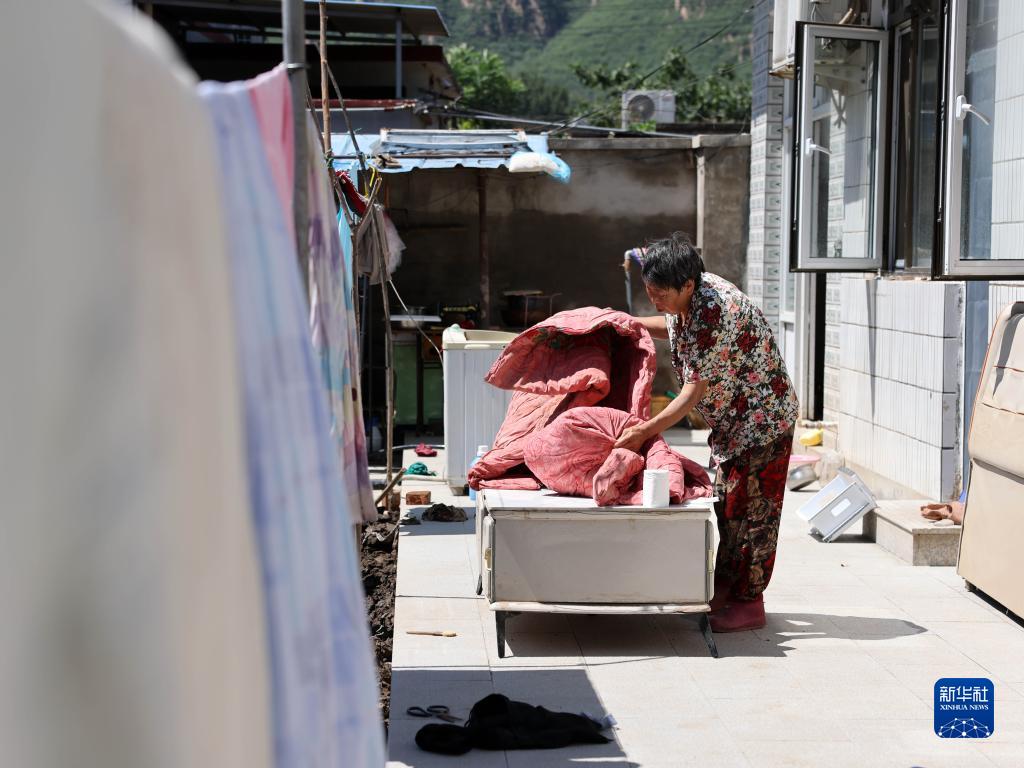 8月16日,河北淶水縣九龍鎮北龍門(mén)村的村民在晾曬被褥。