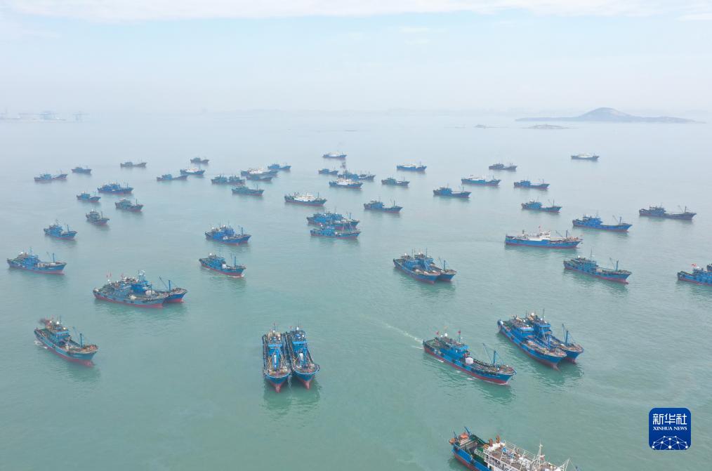 8月16日,漁船從福建泉州市石獅祥芝國家中心漁港出海(無(wú)人機照片)。