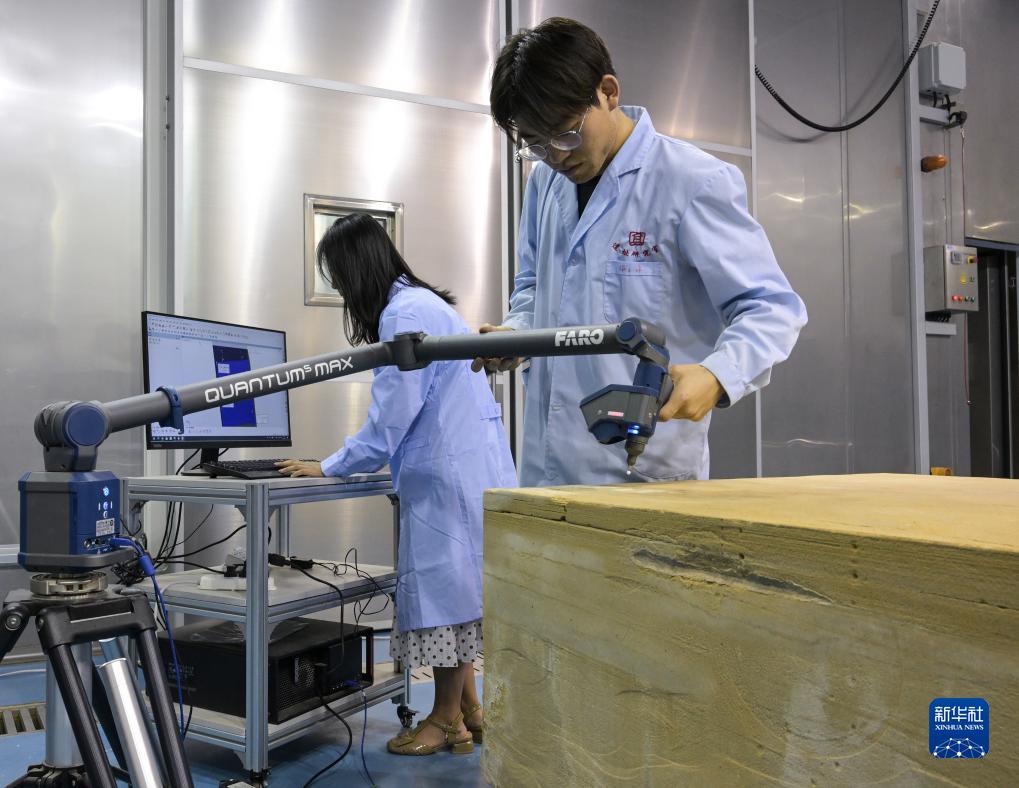 在敦煌研究院多場(chǎng)耦合實(shí)驗室中,工作人員對慶陽(yáng)北石窟寺砂巖樣品進(jìn)行三維掃描分析(8月3日攝)。
