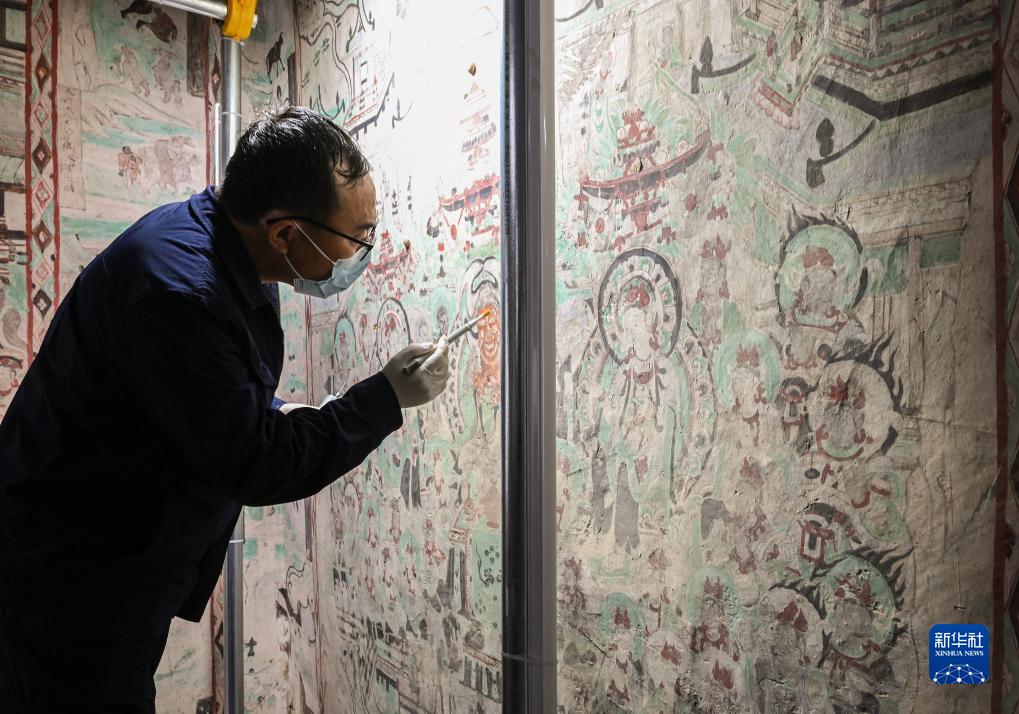 在敦煌莫高窟正在保護修繕的第55窟內,一位文保工作者對壁畫(huà)進(jìn)行修復(8月3日攝)。