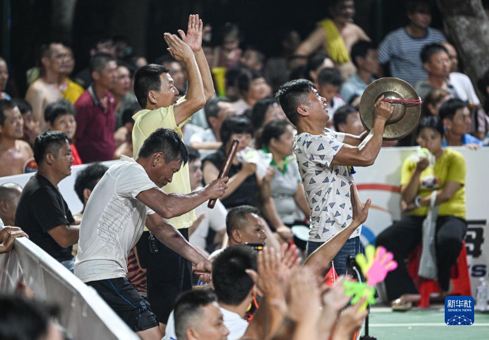 拉拉隊員在“村排”馮坡站比賽期間為所支持的球隊加油助威(7月15日攝)。